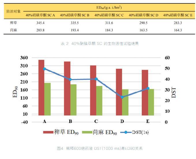 通過對480 g/L硝磺草酮懸浮體系制劑的研究,進而測定5個不同制劑配方的3種稀釋濃度液的動態(tài)表面張力,研究防治效果與動態(tài)表面張力的關系。結果顯示無論對禾本科還是闊葉雜草,懸浮體系藥液的動態(tài)表面張力的變化趨勢,在一定程度上與其藥效正相關。