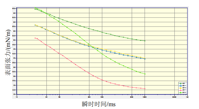 通過檢測不同制劑配方的藥液動態(tài)表面張力,以達到藥液有效快速附著、潤濕葉片的目的,來提升藥效。通過分析30 ms到1000 ms內(nèi),稀釋藥液在表面吸附期的動態(tài)表面張力迅速變化,來初步判斷藥液與雜草葉面的接觸和潤濕情況。最終結合室內(nèi)藥效數(shù)據(jù),來研究藥液動態(tài)表面張力與藥效關系。