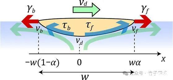 圖6是描述BS液滴自推進的簡化模型。紅色箭頭所示的γf和γb分別代表液滴前部和后部界面張力所產生的力的大小。用藍色箭頭繪制的τf和τb分別代表來自向前和向后界面流的粘性力。綠色箭頭表示液滴下方的流動,vb、vd和vf表示液滴下方每個x位置處的流速。假設τb和vb具有負值,因為它們處于液滴運動的相反方向。