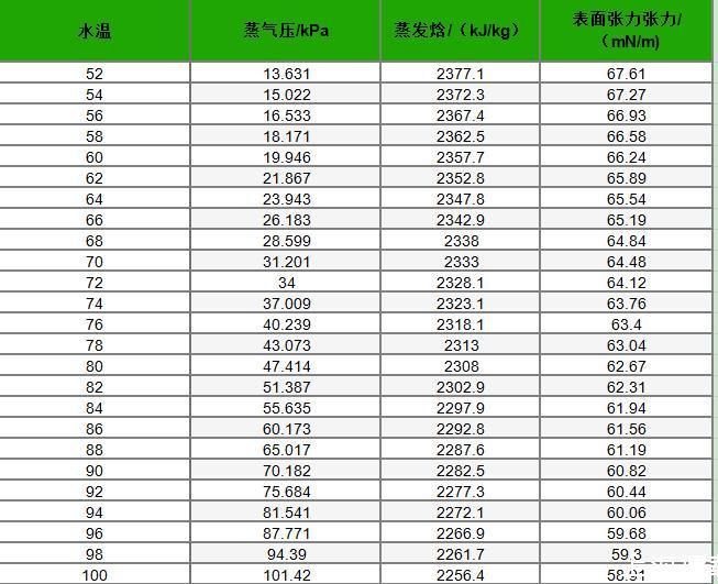 不同溫度下水的蒸氣壓、蒸發焓及表面張力