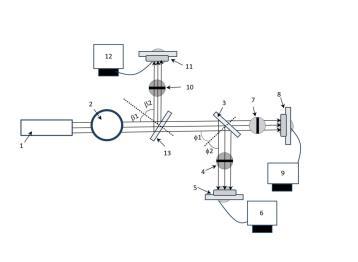 第一分束鏡13與第二分束鏡3之間的距離為5厘米,第二光闌7與第二分束鏡3之間的距離為5厘米,第二光闌7與第二光電探測器8之間的距離為5厘米。第三光闌4與第二分束鏡3之間的距離為5厘米,第三光闌4與第三光電探測器5之間的距離為5厘米。入射光與分束鏡法向之間的夾角為,分束鏡法向與反射光之間的夾角為。,。