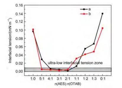 AES/烷基季銨鹽CTAB摩爾比為1:1的混合體系的β參數計算結果為~20.4,表明AES與烷基季銨鹽CTAB親水基間具有極強的吸引作用。值得注意的是,該體系還具有很高的溫度穩定性,在55°C時仍能保持30 mN·m-1以下的表面張力。這說明在較高溫度時該體系的分子排列仍然較為緊密,這和陰陽離子表面活性劑體系中分子因靜電吸引造成的緊密排列是密切相關的。考慮到油水界面張力同樣與界面上的分子排列有關,因此有可能在溫度較高時實現超低界面張力。