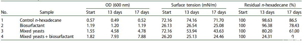 表 4. 正十六烷生物降解試驗中的細菌生長、表面張力和正十六烷殘留量(結果為兩次重復的平均值)。