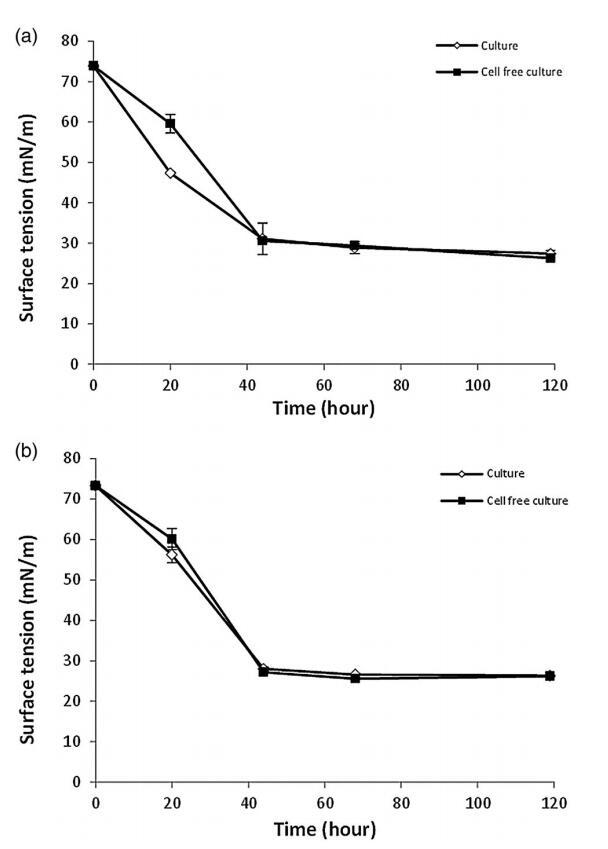 菌株紅球菌屬。 菌株 LF-13 和紅球菌屬。 大約 2 天后,菌株 LF-22 達到穩定期(圖 1)。 LF-13 和 LF-22 的培養物表面張力的最低值分別為 31.8 和 29.3 mN m-1,當培養物達到穩定期時(圖 1)。 無細胞制劑的值顯示出與培養物類似的降低,表明生物表面活性劑被釋放到培養基中。 從工業角度來看,將生物表面活性劑分泌到培養基中的分離物很有趣,因為這使得生物表面活性劑的純化過程更簡單。 [16,44,45]