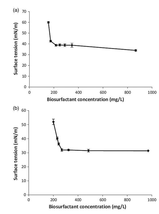 如材料和方法部分所述,使用 MTBE 從兩種紅球菌屬菌株的靜息細胞培養物中提取生物表面活性劑。 提取的生物表面活性劑用于測定CMC濃度。 來自菌株 LF-13 的生物表面活性劑的 CMC 約為 217 mg/L,菌株 LF-22 的 CMC 約為 269 mg/L(圖 3)。