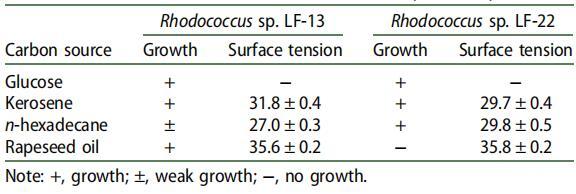 兩種細菌菌株紅球菌屬。 菌株 LF-13 和紅球菌屬。 當以煤油作為唯一碳源和能源時,菌株 LF-22 能夠將培養基的表面張力降低約 40 mN m-1。 因此,它們被選擇用于進一步表征生物表面活性劑的生產。 為了拓寬生物表面活性劑生產的底物范圍,測試了除煤油和葡萄糖之外的其他碳源(表 3)。 這兩種菌株可以在葡萄糖上生長,但不合成生物表面活性劑。 他們能夠在正十六烷和菜籽油上產生 SAC,即使菜籽油不支持菌株 LF-22 的生長。