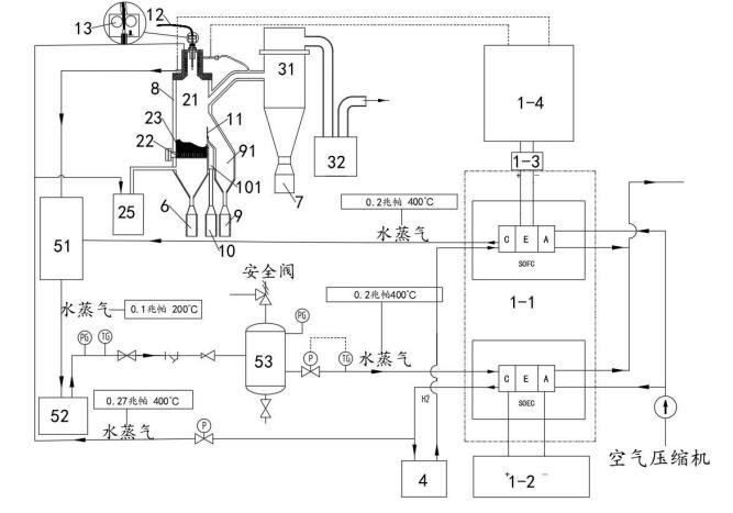 所述供電模塊1中的SOFC燃料電池產生的水蒸氣(0.2Mpa,400℃)進入所述汽水混合加熱器51中,所述等離子噴射模塊2、分離過濾模塊3、粗粉收集罐6、細粉收集罐7與冷卻模塊8換熱后的水(當冷卻介質為水時)也進入所述汽水混合加熱器51中,通過所述汽水混合加熱器51的作用將其轉化為水蒸氣并傳輸到所述蒸汽發生器52中,所述蒸汽發生器52將水蒸氣以(0.2Mpa,400℃)的狀態傳輸到穩壓罐53中,通過穩壓罐53穩壓并去除水蒸氣中夾雜的水滴后,高溫的水蒸氣進入SOEC電解池中參與電解制氫,并通過儲氫模塊4將制備的氫氣存儲備用。該過程將分離提純過程中供電模塊1中燃料電池燃燒放電產生的高溫水蒸氣與冷卻換熱的熱量加以回收利用,為SOEC電解池提供熱量,避免或減少外部能量的輸入,降低成本。