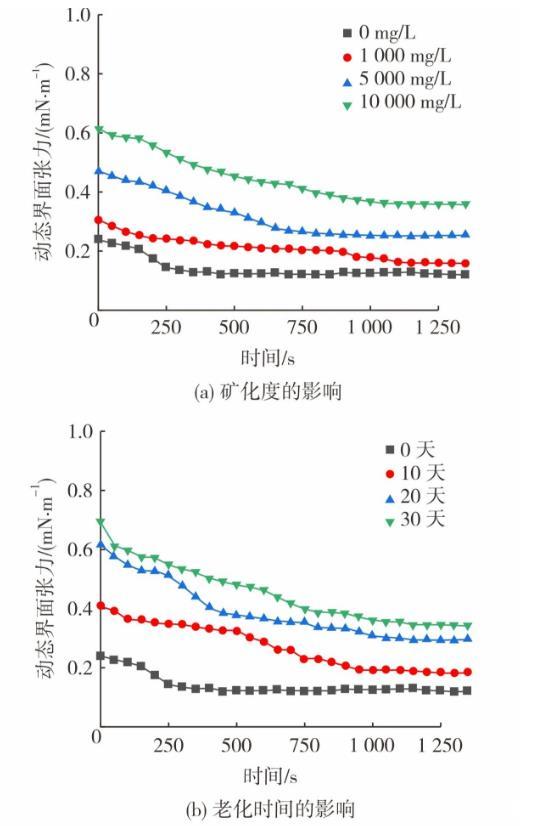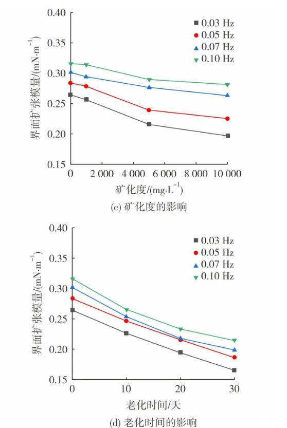 圖3為油藏條件對(duì)動(dòng)態(tài)界面張力及界面擴(kuò)張模量的影響。采用不同礦化度模擬水配制體系(0.06%(w)凍膠分散體+0.10%(w)降黏劑),在50℃老化10天。圖3(a)和圖3(c)呈現(xiàn)了礦化度對(duì)體系界面流變性質(zhì)的影響。從圖3可知,隨著礦化度的提高,老化后體系的動(dòng)態(tài)界面張力穩(wěn)定值從0.127 mN/m增至0.356 mN/m。降黏劑帶有磺酸鹽基團(tuán),有較強(qiáng)的耐溫耐鹽能力,因此界面張力的提升幅度有限。此外,體系的界面擴(kuò)張模量隨礦化度的增大而減低,這是由于地層水陽離子會(huì)對(duì)凍膠分散體之間的擴(kuò)散雙電層產(chǎn)生壓縮作用,減小凍膠分散體表面負(fù)電量,降低其分散穩(wěn)定性,體系黏度隨之下降。