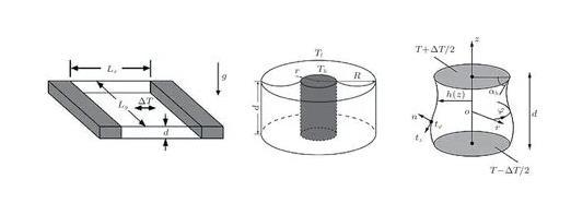 液層模型是源自于空間晶體生長實驗探索的簡化模型,是研究微重力條件下界面張力梯度驅(qū)動對流基本流動規(guī)律的經(jīng)典模型。液層模型主要包括矩形液層(rectangular pool)、環(huán)形液層(annular pool)和液橋(liquid bridge)(圖1)等。相對而言,液橋是一類特殊的液層模型。液橋中界面張力梯度驅(qū)動對流的流動穩(wěn)定性研究成果極為豐富,相關(guān)系統(tǒng)的完整臨界轉(zhuǎn)捩描述詳見綜述(Hu et al.2008)。除了極薄液層的情況,在絕大多數(shù)界面張力梯度驅(qū)動對流的地面實驗研究中,界面張力效應(yīng)和重力效應(yīng)間存在較強的耦合作用。