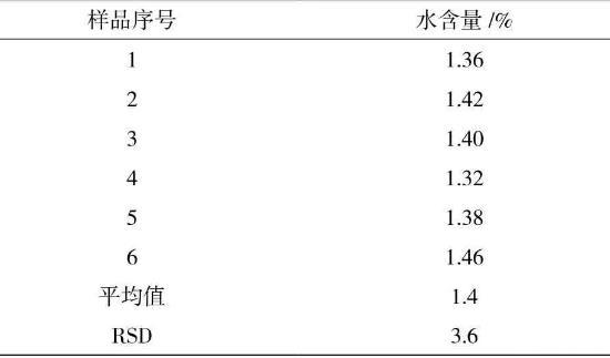 在150℃加熱10 min的測定條件下,采用滴定度為1 mg/mL的費休氏試劑,用卡氏干燥爐自動進樣法測定樣品中水分含量,樣品測定6次,計算6次結果的相對標準偏差(RSD%)數據見表5。結果表明測定結果具有良好的重復性。