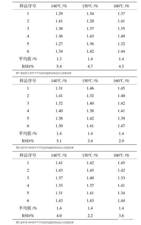 加熱爐樣品轉換器的溫度直接影響樣品中水分的蒸發;終止條件也是影響測定結果的關鍵因素,加熱時間太短,樣品中的水分未完全蒸發,導致測定結果偏低;加熱時間太長,則延長了測定時間,環境因素的影響變大,因此需要選擇合適的終止時間和加熱溫度[3]。試驗分別選擇自動終止、加熱10 min和加熱15 min作為終止條件,在不同的終止條件下分別選擇了140、150、160℃作為加熱溫度,每種條件下連續進樣6次。結果見表1、表2、表3。結果表明,當選擇自動終止條件時,三個加熱溫度的樣品結果的RSD相對較大;當選擇10 min和15 min作為終止條件時,加熱溫度為150℃和160℃時,樣品結果的差異較小。因此選擇加熱溫度150℃,終止條件為10 min比較合適。