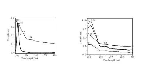 圖4化合物1氯仿溶液(a)和LB膜(30層)的紫外光譜(b)(左圖),在不同亞相(a)純水,(b)乙二酸,(c)丙二酸,(d)丁二酸時(shí)轉(zhuǎn)移30層膜的紫外光譜(右圖)