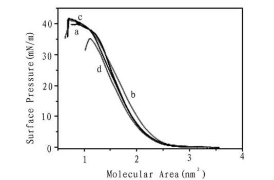 圖3化合物1的壓縮/擴(kuò)張循環(huán)等溫線(左圖,a,b,c分別為1,2,3次)和不同亞相上的膜穩(wěn)曲線(右圖,a純水,b乙二酸,c丙二酸,d丁二酸)