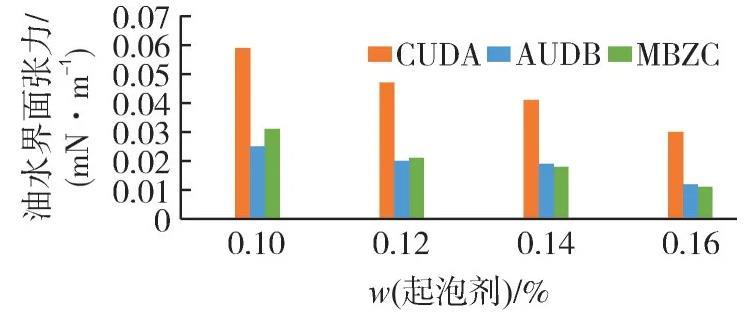 由圖3可知:隨著起泡劑用量的增加,3種起泡劑的油水界面張力逐漸降低,且在質量分數達到0.16%時,油水界面張力降低到最低值,其中AUDB與MBZC型起泡劑的油水界面張力均低于0.02 mN/m,達到低界面張力驅油的要求。