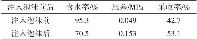 由表1可知:在注入泡沫前,采出液的含水率達到95.3%,在向膠結巖心中注入0.3 PV的泡沫流體后含水率顯著下降到70.5%,注入泡沫流體前后壓差達0.104 MPa,說明AUDB型起泡劑混合氮氣形成的泡沫具有良好的封堵效果。注入泡沫流體后,采收率明顯提高,由42.7%提高至53.1%,說明AUDB型起泡劑具有良好的洗油效果。