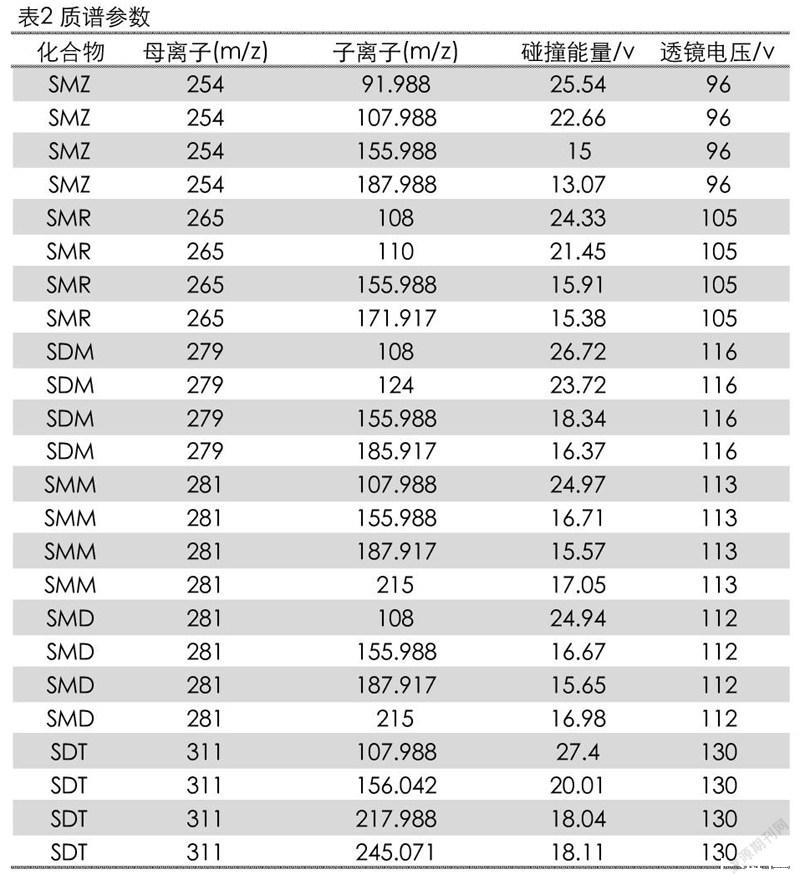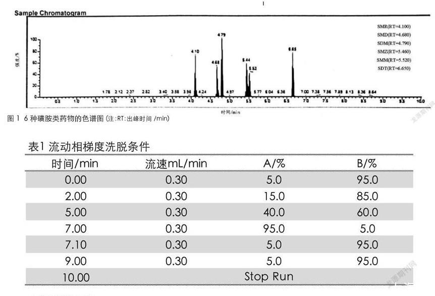 6種磺胺類標(biāo)準(zhǔn)物質(zhì):磺胺甲惡唑(SMZ)、磺胺甲基嘧啶(SMR)、磺胺間二甲氧嘧啶(SDM)、磺胺間甲氧嘧啶(SMM)、磺胺對甲氧嘧啶(SMD)、磺胺地索辛(SDT)(純度均大于99.5%,北京振翔科技有限公司);乙腈(色譜純,德國Merck公司);甲酸(色譜純,上海安普實驗科技有限公司)。