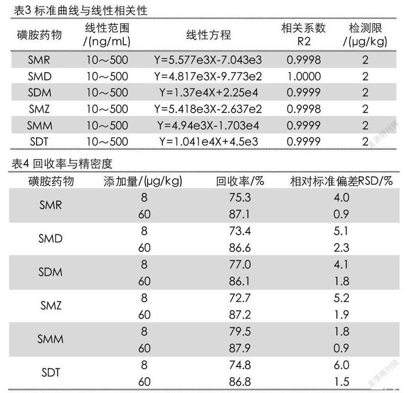 制備混合標(biāo)準(zhǔn)濃度系列,分別為10、50、100、250和500 ng/mL(分別相當(dāng)于被測組分的含量為2、10、20、50和100μg/kg)。將標(biāo)準(zhǔn)工作液按照2.3.3的方法進樣測試。以進樣濃度為橫坐標(biāo),以峰面積的響應(yīng)值為縱坐標(biāo)繪制標(biāo)準(zhǔn)曲線,結(jié)果如表3所。6種磺胺類藥物在濃度10~500 ng/mL范圍內(nèi)線性關(guān)系很好,相關(guān)系數(shù)R2≥0.9998。