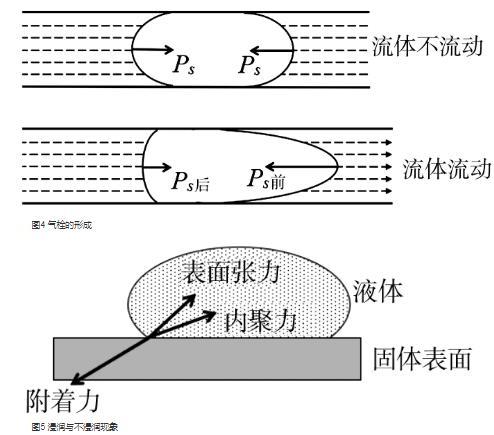 如圖4所示,當流管中流體不流動時,流體中的氣泡呈橢球狀,兩邊對稱.但當流體流動時會造成氣泡的變形,沿流體前進方向,氣泡前端被“拉伸”而變尖,曲率半徑變小;而后方被“推壓”而變凸,曲率半徑變大.由(2)式可知,前端的附件壓強PS前要比后端的附加壓強PS后大,從而造成流體流動受阻.當氣泡較多時阻力隨著增大,就造成了氣栓。