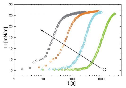 已經建立了一個狀態(tài)方程來關聯(lián) 表面壓力和吸附量,我們現(xiàn)在繼續(xù) 研究顆粒的吸附動力學。 為此我們 監(jiān)測新鮮的界面張力的演變 在 PNIPAM 顆粒懸浮液中制備氣泡作為 時間的函數(shù)。 我們轉換界面張力值 轉化為表面壓力。 結果如圖 4 所示。 表面壓力值最初迅速增加,然后 放松到最終的平衡值。 動態(tài)可以一目了然 分為兩個獨立的時間尺度:初始快速 由表面壓力增加表示的動力學 值,以及隨著系統(tǒng)向最終放松而緩慢的部分 平衡狀態(tài)。 快速動力學之間的這種區(qū)別 短時間和長時間慢得多的動力學是許多表面活性物質的吸附行為的特征 材料.32,33