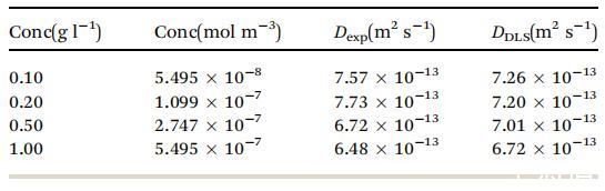 表 1 擴散系數(shù) D (m2 s- 1 ) 對于各種 從實驗 G vs. t1/2 曲線計算的濃度 與使用 DLS 測量的相比