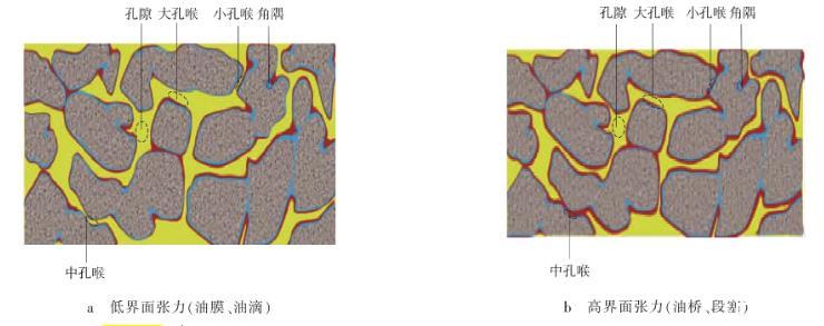 凝析氣藏開發過程中伴隨著油氣界面張力σog的變化,當地層壓力高于露點壓力時,處于混相狀態,油氣界面張力接近0 mN/m;當地層壓力略低于露點壓力時,出現反凝析現象,少量凝析油析出,此時油氣界面張力較小,析出的凝析油以油膜狀態附著在束縛水之上,即以油膜鋪展方式分布于儲層中。在曲率較大的孔隙角隅處,由于毛細凝聚作用,以油滴方式分布,凝析油易流動,實驗測量的凝析油臨界流動飽和度一般小于10%[14](見圖1a);隨著凝析氣藏的開發,當地層壓力遠低于露點壓力時,大量凝析油析出,油氣界面張力迅速增加,到最大反凝析壓力時的界面張力可比露點壓力時的高2個數量級[4]。析出的凝析油大部分以段塞的形式分布于孔隙喉道與角隅,相對于凝析油膜更難以流動,凝析油臨界流動飽和度增大(見圖1b)。