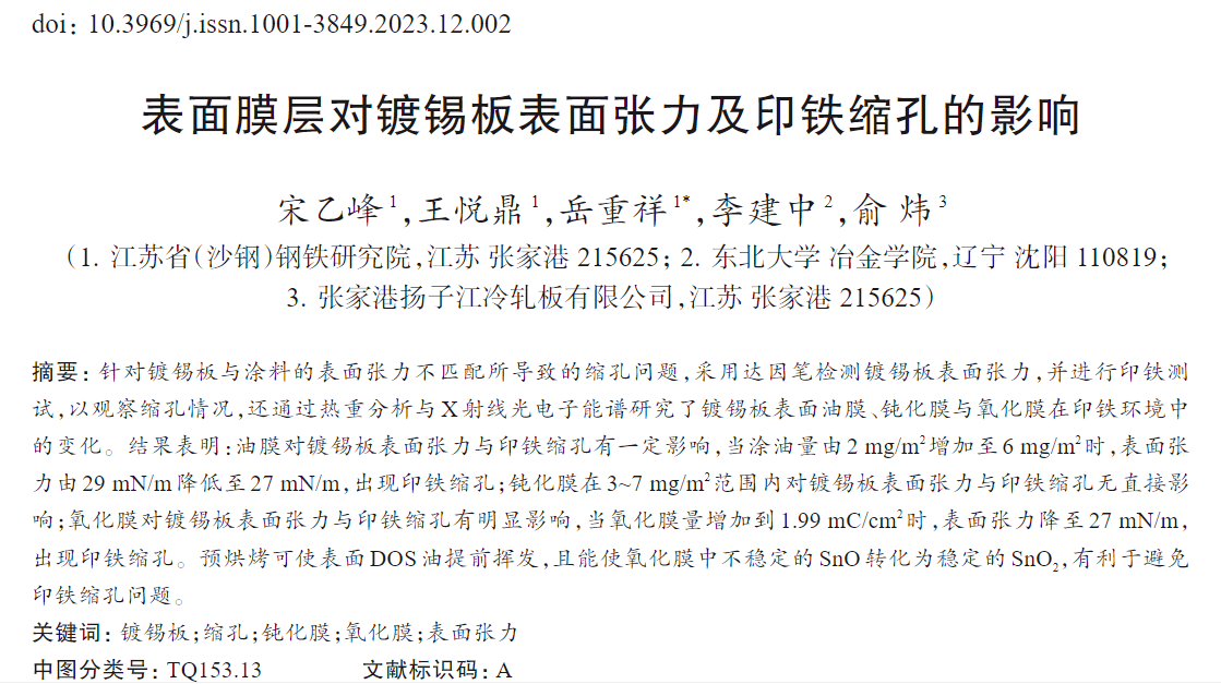 針對鍍錫板與涂料的表面張力不匹配所導致的縮孔問題,采用達因筆檢測鍍錫板表面張力,并進行印鐵測試,以觀察縮孔情況,還通過熱重分析與X射線光電子能譜研究了鍍錫板表面油膜、鈍化膜與氧化膜在印鐵環境中的變化。