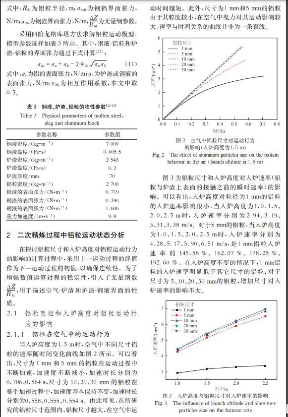 摘要: 二次精煉過程中,鋁是鋼液進行脫氧及合金化的主要物料之一,但純鋁的密度小于鋼液,能否穿越渣層與鋼液接觸及接觸時間對鋁的脫氧效果和鋼中溶解鋁的含量有直接影響。在忽略鋁的熔化、溶解及化學反應的情況下,通過對鋁粒運動過程受力分析,建立鋁粒在氣-渣-鋼相內的三維運動數學模型,明晰鋁粒尺寸及入爐高度對鋁粒運動軌跡的影響。