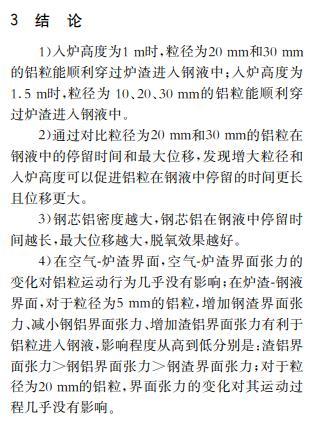 結果表明:在渣層厚度為70 mm且入爐高度為1~1.5 m的情況下,1 mm和5 mm的鋁粒在渣鋼界面處波動;入爐高度為1 m時,粒徑為10 mm的鋁粒停留在渣鋼界面處,但在入爐高度為1.5 m及以上時可以進入鋼液;20 mm及以上尺寸的鋁??梢赃M入鋼液。在入爐高度為1 m時、30 mm尺寸的鋁粒在鋼液中的停留時間與深度相較于20 mm的基礎上分別增加22.86 %和50.00 %;在鋁粒尺寸為20 mm時、入爐高度為1.5 m時的鋁粒在鋼液中的停留時間與深度在1 m的基礎上分別增加5.71 %和10.00 %。