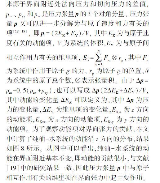 在界面張力的模擬計(jì)算公式(5)中,界面張力來(lái)源于界面附近處法向壓力和切向壓力的差值,pxx、pyy和pzz是壓力張量p的3個(gè)對(duì)角分量,壓力張量p又可以進(jìn)一步分解為與原子速度和力有關(guān)的項(xiàng),即p=(2EK+EV)/V,其中EK為與原子速度有關(guān)的動(dòng)能項(xiàng),V為系統(tǒng)的體積,EV為與原子間相互作用力有關(guān)的維里項(xiàng),EV=∑Ng=1Fg?rg,其中Fg為系統(tǒng)中作用于原子g的力,rg為原子g的位置,N為系統(tǒng)中的原子總個(gè)數(shù),?表示張量積。由于Δp=pzz-0.5(pxx+pyy),也可以寫(xiě)成Δp(2ΔEK+ΔEV)/V,其中動(dòng)能的變化量ΔEK可以定義為,其中Δp為壓力的變化量,ΔEV為維里項(xiàng)的變化量,EKzz為z方向的動(dòng)能項(xiàng),EKxx為x方向的動(dòng)能項(xiàng),EKyy為y方向的動(dòng)能項(xiàng)。為了觀察動(dòng)能項(xiàng)對(duì)界面張力的貢獻(xiàn),本文中計(jì)算了純油-水系統(tǒng)的動(dòng)能沿z方向的分布,結(jié)果如圖8所示。從圖中可以看出,純油-水系統(tǒng)的動(dòng)能在界面附近基本不變,即動(dòng)能的貢獻(xiàn)很小,與文獻(xiàn)中的研究結(jié)果一致,因此壓力張量p中與原子相互作用有關(guān)的維里項(xiàng)在界面張力中起主要作用。因?yàn)閴毫埩恐械膭?dòng)能項(xiàng)對(duì)壓力影響很小。