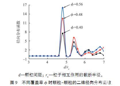 本文中主要關(guān)注與顆粒間相互作用有關(guān)的維里項(xiàng)對(duì)界面張力的影響。為了研究顆粒間相互作用對(duì)界面張力的影響,本文中建立了油-水界面的多顆粒吸附模型。界面張力與顆粒在界面上的覆蓋率有關(guān),界面覆蓋率?可定義為?=nπd20/4A,其中n為界面吸附顆粒的個(gè)數(shù),A為界面面積,d0為界面顆粒與顆粒之間的二維徑向分布函數(shù)第一個(gè)最高峰橫坐標(biāo),表示顆粒與顆粒間的最短距離。圖9所示為3種不同覆蓋率時(shí)顆粒-顆粒的二維徑向分布函數(shù)。圖中曲線(xiàn)第一個(gè)最高峰值的橫坐標(biāo)為4.8rc,表示界面上顆粒間的最短距離,也被視為顆粒的有效半徑,可通過(guò)該有效半徑獲得顆粒的真實(shí)覆蓋率。