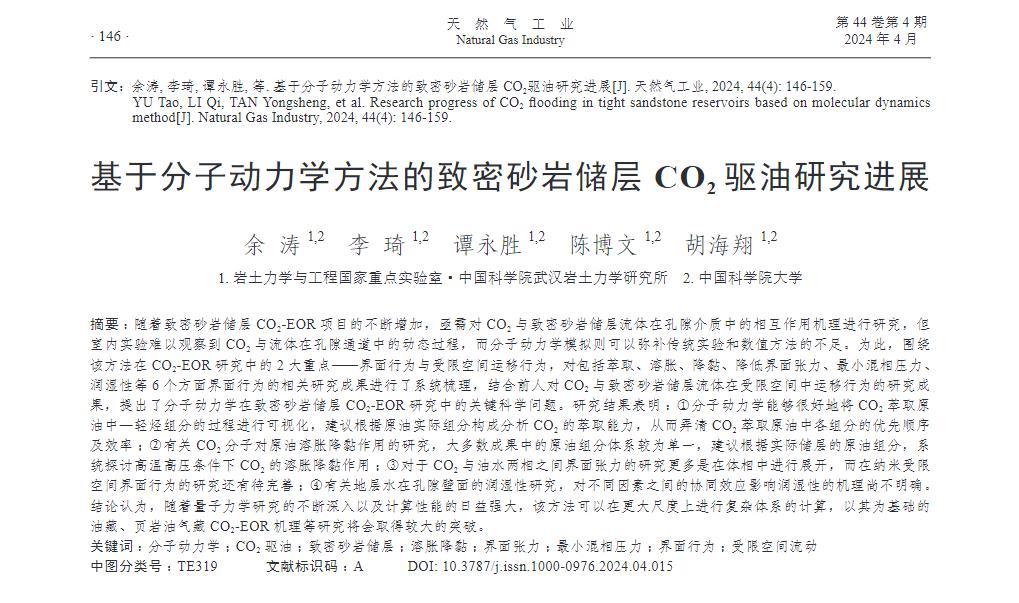 隨著致密砂巖儲(chǔ)層CO2-EOR項(xiàng)目的不斷增加,亟需對(duì)CO2與致密砂巖儲(chǔ)層流體在孔隙介質(zhì)中的相互作用機(jī)理進(jìn)行研究,但室內(nèi)實(shí)驗(yàn)難以觀察到CO2與流體在孔隙通道中的動(dòng)態(tài)過(guò)程,而分子動(dòng)力學(xué)模擬則可以彌補(bǔ)傳統(tǒng)實(shí)驗(yàn)和數(shù)值方法的不足。為此,圍繞該方法在CO2-EOR研究中的2大重點(diǎn)——界面行為與受限空間運(yùn)移行為,對(duì)包括萃取、溶脹、降黏、降低界面張力、最小混相壓力、潤(rùn)濕性等6個(gè)方面界面行為的相關(guān)研究成果進(jìn)行了系統(tǒng)梳理,結(jié)合前人對(duì)CO2與致密砂巖儲(chǔ)層流體在受限空間中運(yùn)移行為的研究成果,提出了分子動(dòng)力學(xué)在致密砂巖儲(chǔ)層CO2-EOR研究中的關(guān)鍵科學(xué)問(wèn)題。