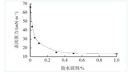 隨著NaCl含量增大,鹽水溶液的表面張力逐漸增大。當NaCl含量加量為7%時,鹽水的表面張力仍低于20 mN/m,表明該防水鎖劑具有良好的抗鹽性能。