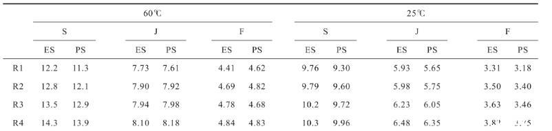 表2為三種試樣最終收縮開裂裂隙度的相關研究結果。從表2可以看出,同組試驗各平行樣的最終收縮開裂裂隙度基本一致,說明該試驗具有良好的可重復性。60℃條件下純水(S樣)的四次干濕循環最終平均δ分別為11.8%、12.4%、13.2%、14.1%,酒精溶液(J樣)分別為7.7%、7.9%、8.0%、8.1%,肥皂水(F樣)分別為4.5%、4.6%、4.7%、4.8%;25℃條件下S樣的四次干濕循環最終平均δ則分別為9.5%、9.6%、9.9%、10.1%,J樣分別為5.8%、5.9%、6.1%、6.4%,F樣分別為3.2%、3.4%、3.5%、3.7%。可見,在同種溫度條件下,同組試樣的最終δ隨著干濕循環次數的增加而增大;而在不同溫度條件下,同組試樣的最終δ同樣隨溫度的增加而增加,取第四次循環來看,60℃條件下的純水、酒精溶液和肥皂水試樣的最終δ分別較25℃條件下的高4.0%、1.7%和1.1%。將25℃和60℃條件下的最終δ進行對比,不論何種溫度條件下,純水樣的最終δ大于酒精溶液樣和肥皂水樣的最終δ;其中,酒精溶液樣的最終δ大于肥皂水。