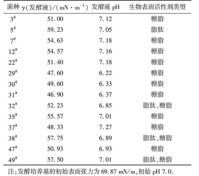 經富集分離共得到49株細菌,初步篩選出14株生長較好的目的菌株接種于發酵培養基。在微生物采油過程中,表面活性劑和有機酸可以把原油從巖層中剝離下來,提高原油流動性。因此,以發酵過程中發酵液的pH和表面張力的降低為指標,對初篩得到的菌株進行復篩,同時分析所產生物表面活性劑的類型,結果見表1。