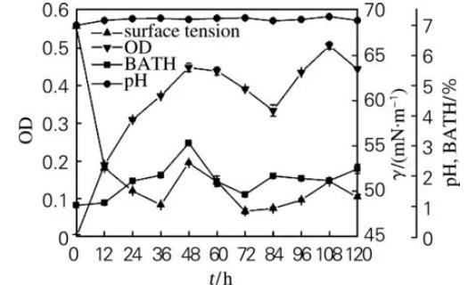 生物表面活性劑產生菌菌體密度、細胞疏水性與發酵液pH及表面張力的關系(二)