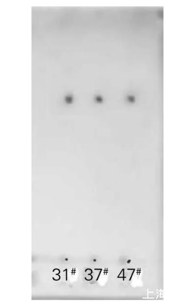 將菌株31#、37#和47#于30℃培養后,對發酵液萃取所得生物表面活性劑粗制品進行硅膠薄層層析,結果如圖4所示。將萃取所得生物表面活性劑粗制品進行酸解,硅膠薄層層析結果如圖5所示。