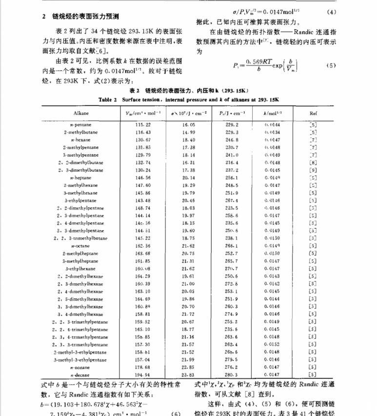 對Davis和Rosseinsky提出的關系檢驗表明,液體的表面張力σ與P1Vm1/3之比不僅取決于溫度,還與液體的種類有關,據此,建立了一個能由鏈烷烴的分子結構準確預測其表面張力的方法。