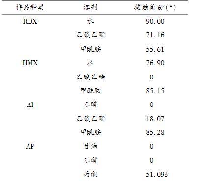 實驗試劑:PNIMMO(工業級【Mn(相對分子質量)=4747],西安近代化學研究所);HMX(60——70μm)、RDX(30——50μm)工業品,甘肅銀光化工集團有限公司;高氯酸銨(AP,粒度20——30μm)、Al(粒度40μm)、甘油、乙二醇、乙醇、乙酸乙酯、甲酰胺、丙酮,工業級,市售;去離子水,自制。實驗儀器:OCA200接觸角測量儀,德國Dataphysics公司;YP——15手動粉末壓片機,天津中世沃克科技發展有限公司;AHX——871安全烘箱,南京理工大學機電廠。