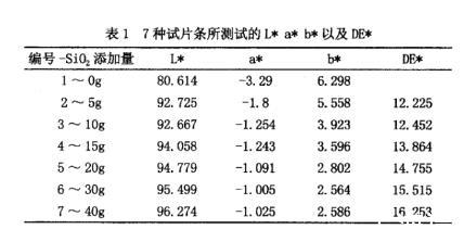 由表1可以看出,選擇沒用添加二氧化鈦的高溫尼龍HTN即1~0g做為標(biāo)準(zhǔn)樣,并測試其L*,a*,b*數(shù)值,2~5g,3~10g,4~15g,5~20g,6~30g,7~40g做為比較樣。從數(shù)據(jù)上進(jìn)行比較,隨著添加量的增加,2號~7號色差DE*逐漸增加,即試樣表現(xiàn)得越來越白,2號~3號添加量增加5g,雖然L*值變化不明顯,但是b*值變化還是蠻大的,此比例不能說明添加量已經(jīng)達(dá)到飽和狀態(tài)。4號~5號添加量增加5g,L*數(shù)值變化0.7,5號~6號隨著添加量繼續(xù)增加10g,L*數(shù)值只變化0.7,說明隨著二氧化鈦添加量的增加,體系所表現(xiàn)的顏色趨于飽和。