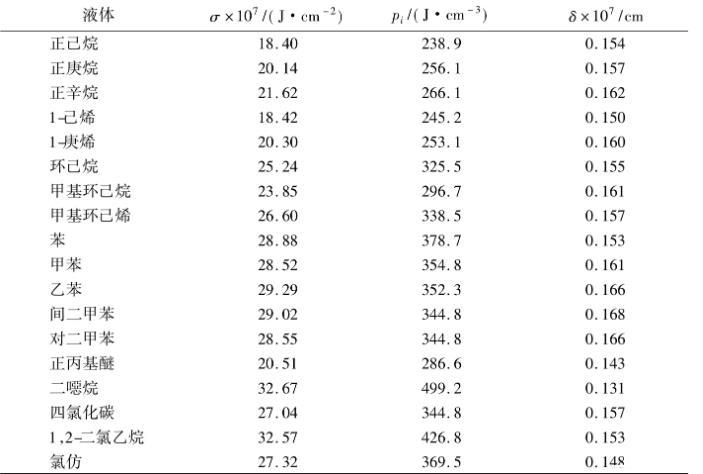 表1 293.15K時若干液體的表面張力、內壓力和表面層厚度