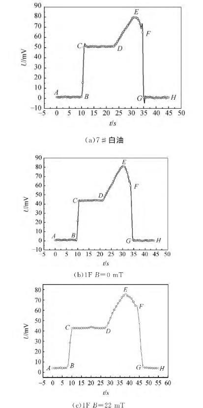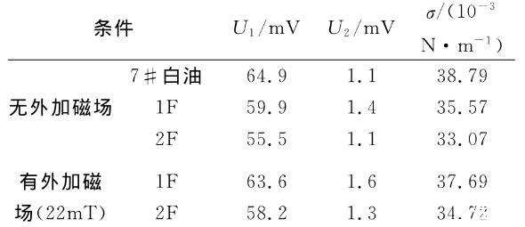 計算機實時在線采集了2種磁性液體及白油液膜拉脫過程中電壓隨時間的變化曲線,如圖4所示。從圖4可看到,3種液體的電壓變化規(guī)律一致,圖中F和G兩點是液膜破裂前后瞬間的電壓值,片狀吊環(huán)的內(nèi)外徑分別為33.10mm和34.69mm,根據(jù)(6)式即可計算出液體的表面張力。室溫(20±0.5)℃時各液體的表面張力見表2.7#白油的表面張力大于磁性液體,這主要是因為表面活性劑的加入降低了液體的表面張力。當22mT的磁場作用于磁性液體時,磁性液體的表面張力增加,這主要是因為無外加磁場作用時,各磁性顆粒的磁矩方向雜亂無章,互相抵消,磁性液體不顯示宏觀磁性。當外加磁場作用于磁性液體時,且磁場方向平行于切線方向的磁性液膜時,各磁性顆粒的磁矩方向轉向外加磁場方向,外加磁場增強了磁偶極子之間的相互作用,導致磁性液體的表面張力增加。