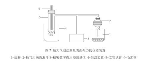 最大壓力氣泡法的原理是將毛細(xì)管端浸入液中,通過(guò)增加內(nèi)壓便產(chǎn)生氣泡,然后從管端成長(zhǎng)的氣泡的最大泡壓可求出液體的表面張力。 最大壓力氣泡法使用的儀器主要為燒杯、抽氣用滴液漏斗、精密數(shù)字微壓差測(cè)量?jī)x、恒溫裝置 、支管試管、毛細(xì)管等。檢測(cè)步驟當(dāng)然也先制樣,然后清洗儀器,之后檢驗(yàn)儀器,調(diào)節(jié)毛細(xì)管或液面高度,使毛細(xì)管口與水面相切。打開(kāi)活塞抽氣,調(diào)節(jié)抽氣速度,使氣泡由毛細(xì)管尖端成單泡出,且每個(gè)氣泡形成的時(shí)間約為 6s-10s。在形成氣泡的過(guò)程中,液面半徑經(jīng)歷:大→小→大,同時(shí)壓力差計(jì)指示值的絕對(duì)值經(jīng)歷:小→大→小的過(guò)程,記錄下絕對(duì)值最大的壓力差三次,取其平均值。最大壓力氣泡法每次測(cè)量前應(yīng)注意:一定要用待測(cè)溶液清洗支管試管和毛細(xì)管,并振蕩洗滌。