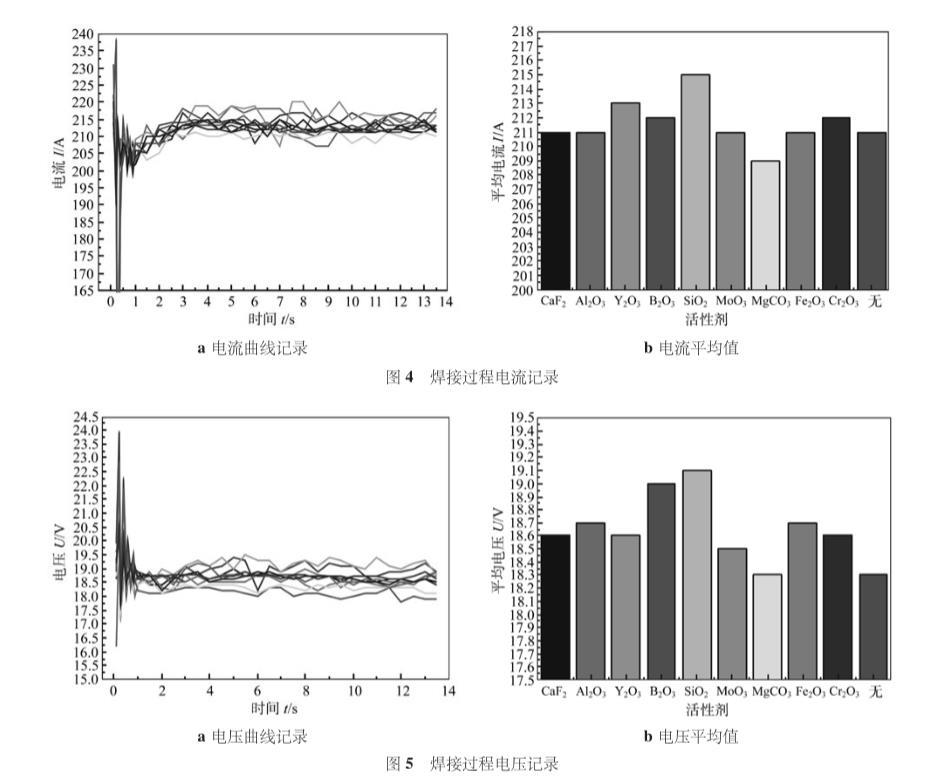 圖4為焊接過(guò)程中電流的記錄。從圖4a可以看出,焊接過(guò)程中各單一活性劑焊接電流曲線基本相似,從圖4b可以看出,大部分活性劑焊接過(guò)程的平均電流與無(wú)活性劑時(shí)相差不大,SiO2和MgCO3的電流平均值相比無(wú)活性劑時(shí)有較為明顯的變化,其中前者增加,后者減小。無(wú)活性劑時(shí)的平均電流達(dá)到211.5 A,而涂SiO2可以達(dá)到215 A。