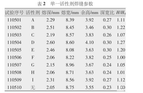 采用對(duì)比實(shí)驗(yàn)法,通過(guò)比較單組分活性劑焊接試驗(yàn)與無(wú)活性劑試驗(yàn)結(jié)果,確定各活性劑的影響次序,分析活性劑對(duì)CMT焊的作用機(jī)理。每組實(shí)驗(yàn)重復(fù)進(jìn)行一次,所得焊縫結(jié)果取平均值。
