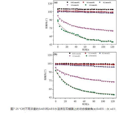 圖7 25℃時不同濃度的SAES和AES水溶液在石蠟膜上的動態接觸角(a)SAES;(b)AES。