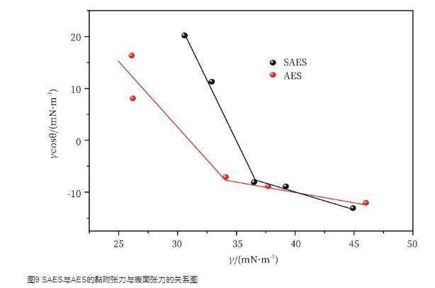 圖9 SAES與AES的黏附張力與表面張力的關系圖