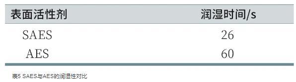 潤濕性是表面活性劑的基本應用性能之一。帆布沉降法測定的是表面活性劑溶液對棉布的潤濕效果,潤濕過程的快慢取決于表面活性劑的性質。由表5可知,SAES、AES對帆布片的潤濕時間分別為26 s和60 s,表明SAES的潤濕性優于AES,這是由于SAES結構中存在支鏈,表面活性劑分子從水溶液中遷移到氣-液界面的速率較快,容易擴散到纖維表面,降低帆布片表面張力的能力較強,從而具有較好的潤濕性。
