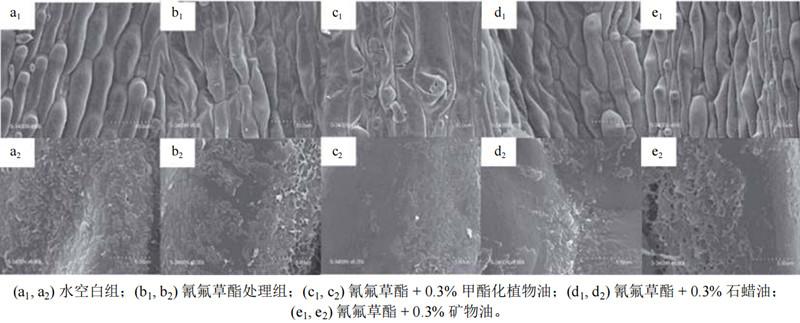 通過(guò)掃描電鏡觀察稗草葉片結(jié)構(gòu)變化探究了油類助劑對(duì)氰氟草酯防除稗草的增效作用。作者分別對(duì)比了純水、氰氟草酯處理和添加油類助劑的氰氟草酯處理后的稗草葉片結(jié)構(gòu),發(fā)現(xiàn)水對(duì)稗草葉表面的蠟質(zhì)層和表皮細(xì)胞沒(méi)有任何影響(圖1a1,a2),氰氟草酯使表皮細(xì)胞略有萎縮(圖1b1),溶解了少量的表皮蠟質(zhì)層(圖1b2),而添加油類助劑后均發(fā)生表皮細(xì)胞變窄萎縮和蠟質(zhì)層溶解的現(xiàn)象(圖1c1-e2)。其中,石蠟油和礦物油能使表皮細(xì)胞變窄變小,水分減少(圖1d1,e1),溶解大約30%的表皮蠟質(zhì)(圖1d2,e2)。甲酯化植物油(MSO)能較大程度地使表皮細(xì)胞萎縮(圖1c1),溶解超過(guò)50%的蠟質(zhì)層(圖1c2)。正是因?yàn)镸SO(體積分?jǐn)?shù)0.5%)溶解了大量稗草葉片的表皮蠟質(zhì)層,嚴(yán)重破壞了葉片的角質(zhì)層,從而極大地增強(qiáng)了稗草葉片對(duì)氰氟草酯的滲透和吸收能力,使其對(duì)氰氟草酯防除稗草的防效提高了78.7%。