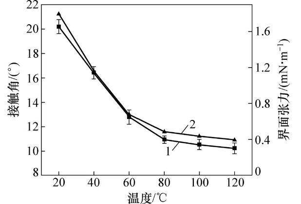 對20,40,60,80,100和120℃溫度下DBTL在CBT500光滑薄板上靜態接觸角進行測量,結果如圖4所示。結合上述溫度下DBTL界面張力1(如圖3所示),將和1代入式(3),計算相應溫度下DBTL與CBT500的接觸角法界面張力12,結果如圖4中界面張力所示。由圖4可知:隨著溫度升高,接觸角和接觸角法界面張力具有相同的下降規律,不同溫度區間內下降趨勢不同,20~60℃溫度區間下降趨勢最大,60~80℃溫度區間下降趨勢次之,80~120℃溫度區間下降趨勢平緩。由Young方程可得cos=(2?12)/1,代入上述關系,即溫度升高,接觸角減小;除此外,不同溫度區間內,DBTL對CBT500初期誘導率不同,從而導致不同溫度區間內靜態接觸角、界面張力下降趨勢不一致。