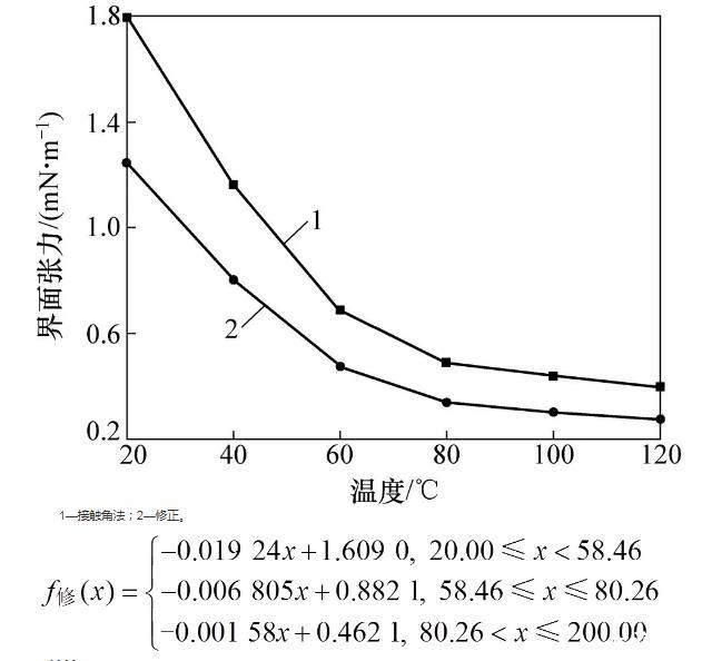 無污染、無反應條件下,溫度對不同材料體系界面張力的影響呈線性關系。本文忽略混合時物質反應與雜質對界面張力的影響,以斜率變化為分界點,采用最小二乘法分段線性擬合修正后界面張力數據,獲得20~120℃溫度范圍內修正后CBT500/DBTL界面張力與溫度函數關系式。依據界面張力與溫度斜率逐漸減小且趨于平緩和界面張力與溫度呈線性關系,以第三段界面張力與溫度關系式作為120~200℃溫度范圍內界面張力函數關系式,即20~200℃溫度范圍內,修正后CBT500/DBTL的界面張力與溫度之間的分段函數關系式為1—接觸角法;2—修正。